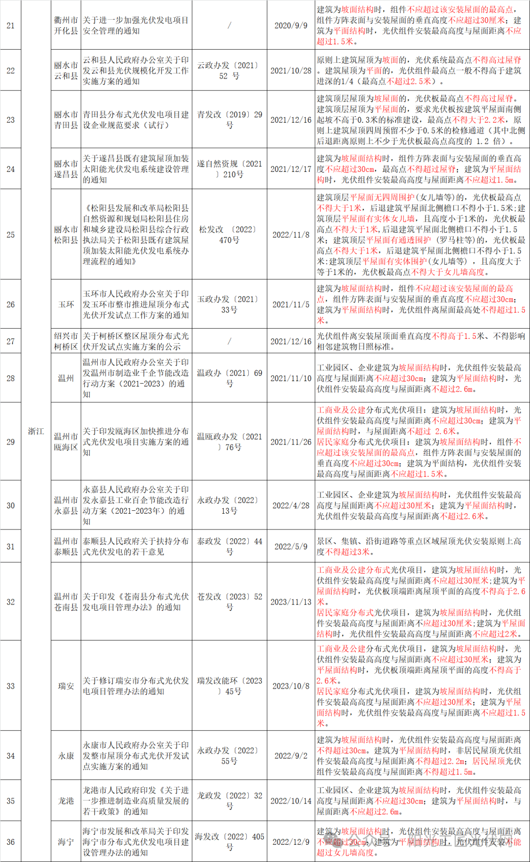 其中,仅浙江省就有16地对屋顶光伏安装高度做出规范,广东省有8地,江西省有6地。