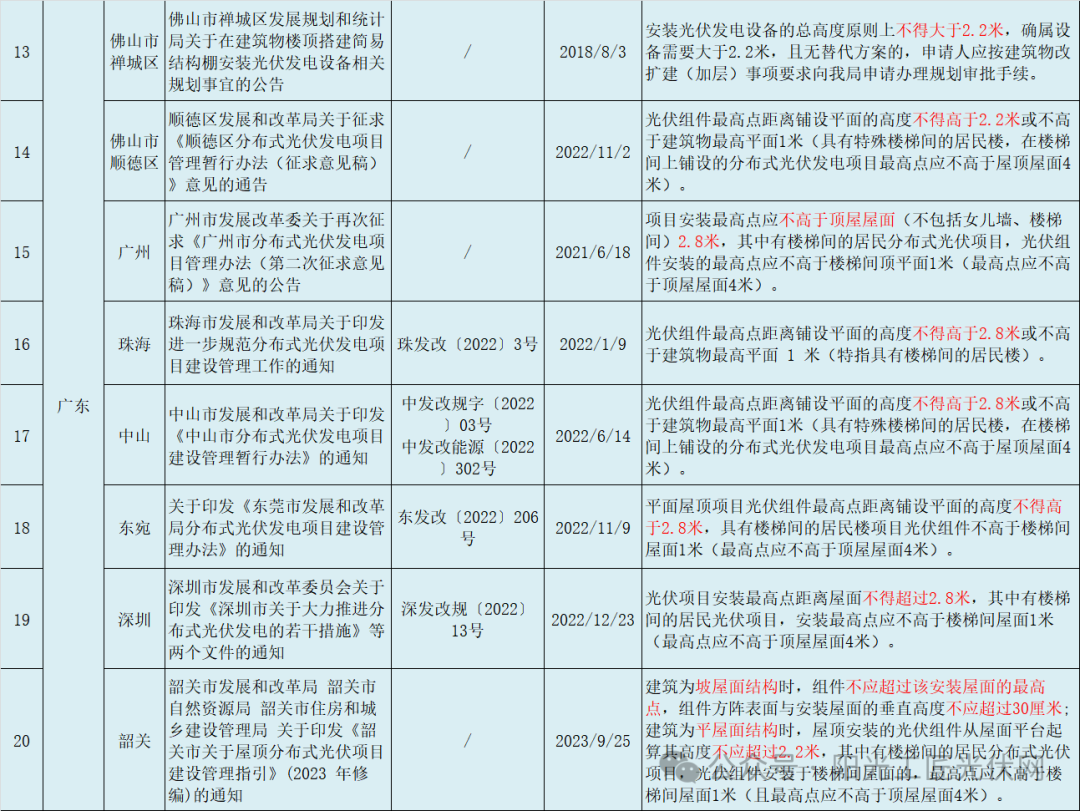 广东省广州市、珠海市、中山市、东菀市、深圳市都规定光伏项目安装最高点距离屋面不得超过2.8米,有楼梯间的居民分布式光伏项目,光伏组件安装的最高点应不高于楼梯间顶平面1米。