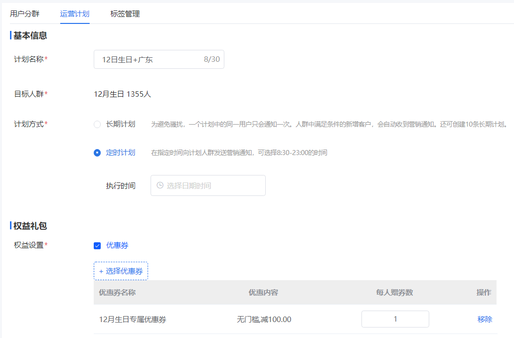 那么我可以在用户列表上筛选,「生日」日期是12月和「地区」是广东,两个特征的用户,统一给此类人群打上“12月生日”的标签,给这批用户发放专属的优惠券/积分/课程权益的运营计划,自动实现精细化运营。