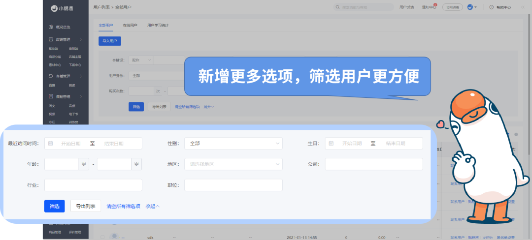 用户列表支持更多的筛选项,帮助商家更快定位和筛选用户,给用户群打上标签,便捷开启精细化运营第一步!