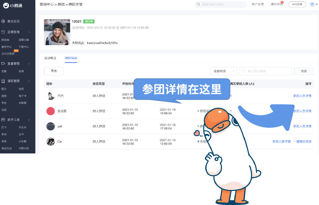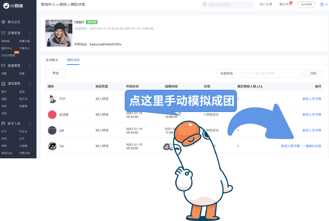 拼团活动开启后,部分用户还无法满足成团条件,商家进入管理台使用“一键模拟成团”功能,快速帮助达成成团。