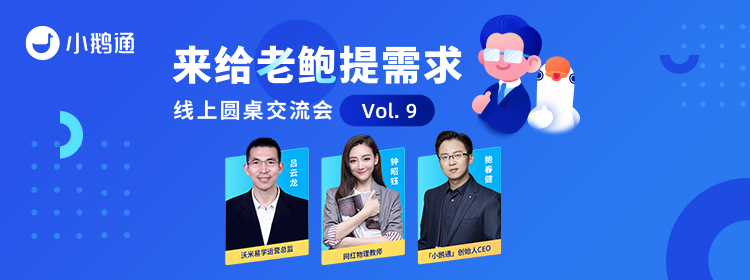如果您对我们有更多需求或者建议,欢迎点击下方《来给老鲍提需求》直播间,直接向小鹅通CEO老鲍提需求!优秀的建议还会有小鹅通旗舰版和鹅公仔赠送哟~