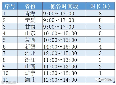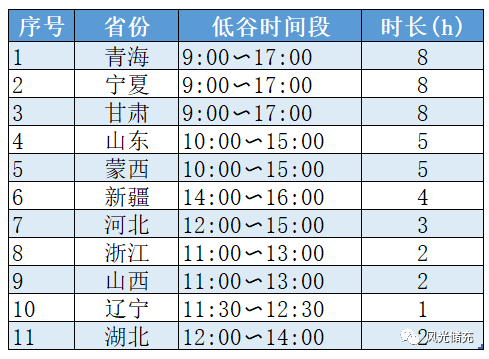 据不完全统计,截止目前全国已经有11个省份部分月份中午出现低谷电价,其中青海、宁夏、甘肃三省午间谷段设置8小时(9-17点)。