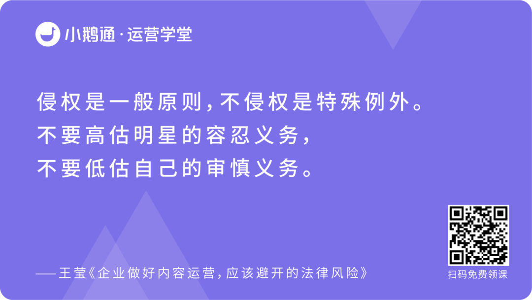 明星没有起诉你,只是一时的容忍,正如王莹老师所说:“侵权是一般原则,不侵权是特殊例外。不要高估明星的容忍义务,不要低估自己的审慎义务。”