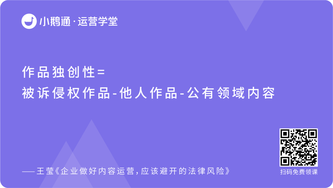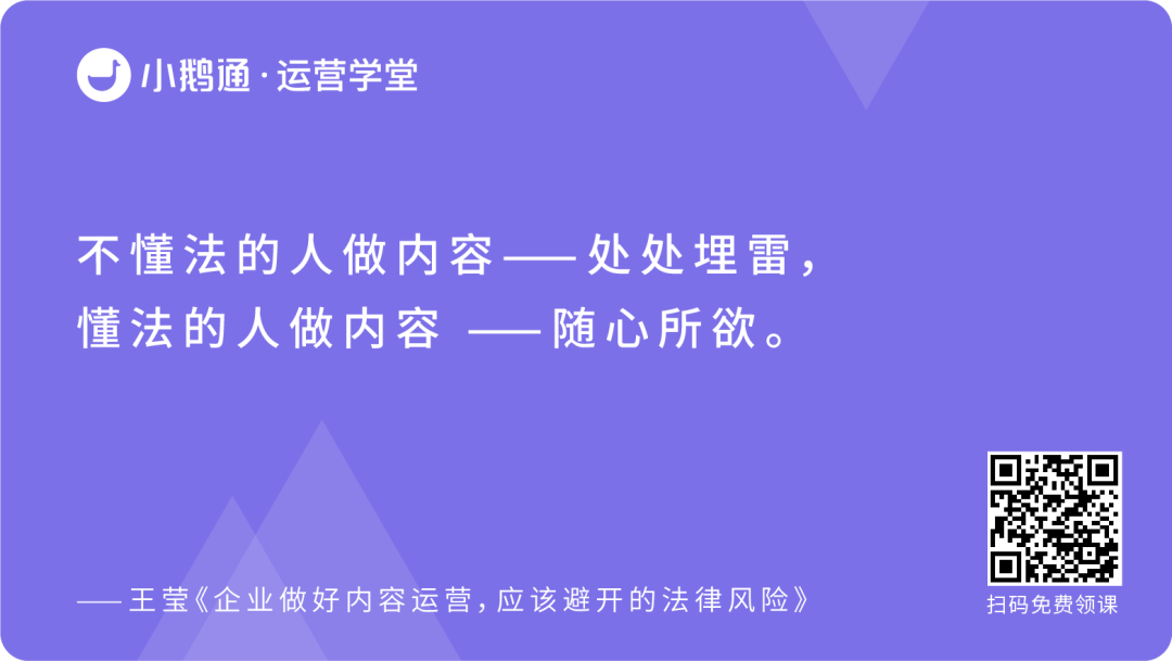 内容侵权的红线纷繁复杂,如果你还一知半解,推荐你学习王莹老师的这门课——《企业做好内容运营,应该避开这些法律风险》,点击图片即可免费领取。