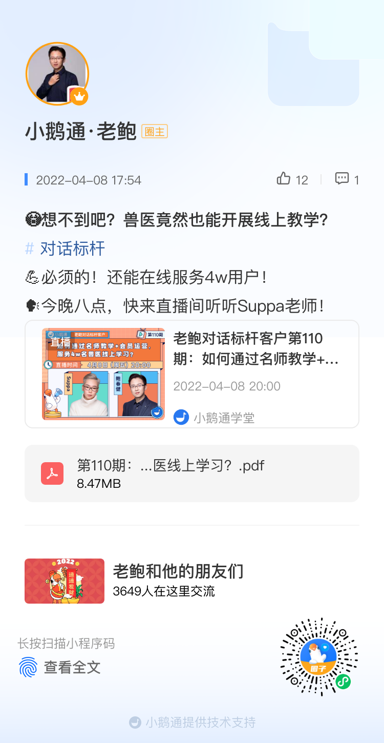 扫描下方二维码,加入小鹅通CEO老鲍的圈子,即可领取完整版课件哟!