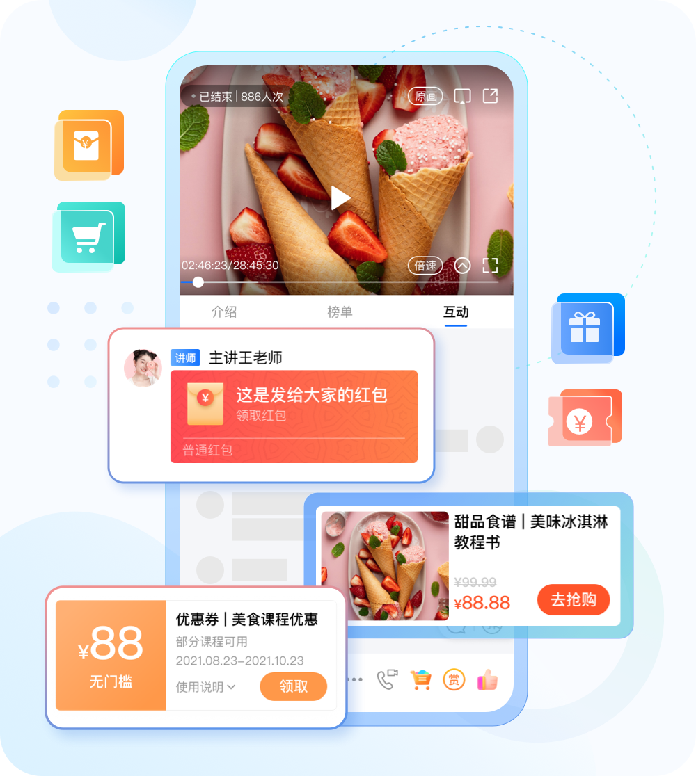 支持抽奖、红包、优惠券、直播间打赏等玩法,直播间内就能下单购买,大幅提升用户购买欲望,让直播间成交率飙升。