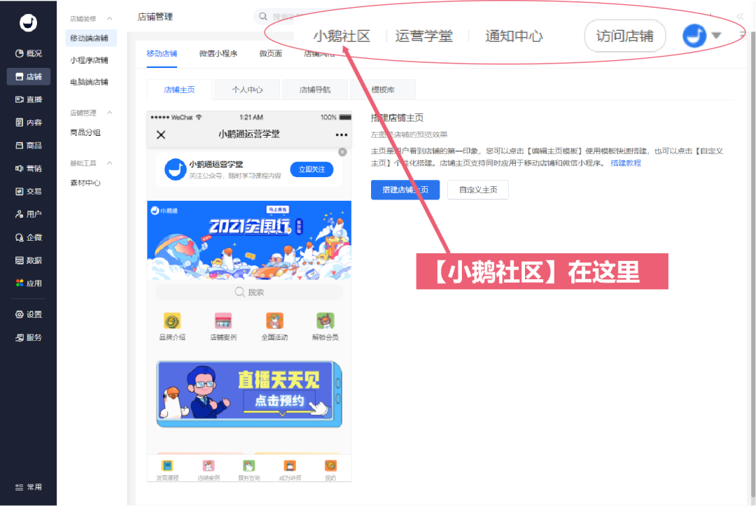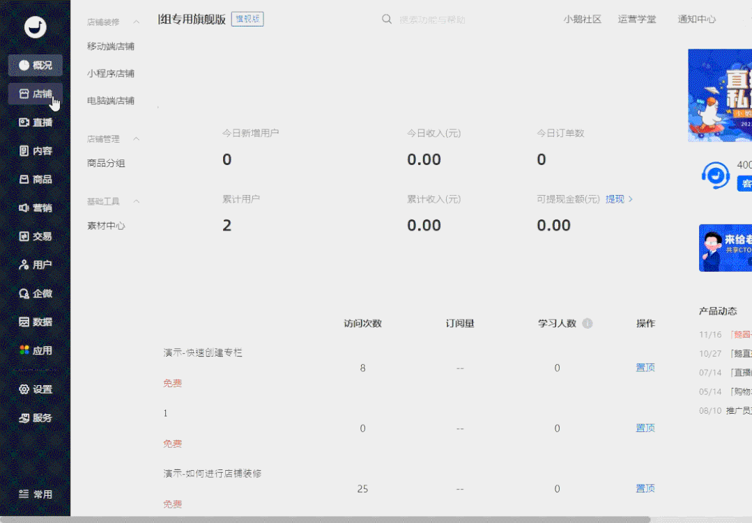 新版管理台右上角增加了小鹅社区入口,支持一键跳转小鹅社区,提需求、和其他商家交流,快速获取小鹅最新产品动态。