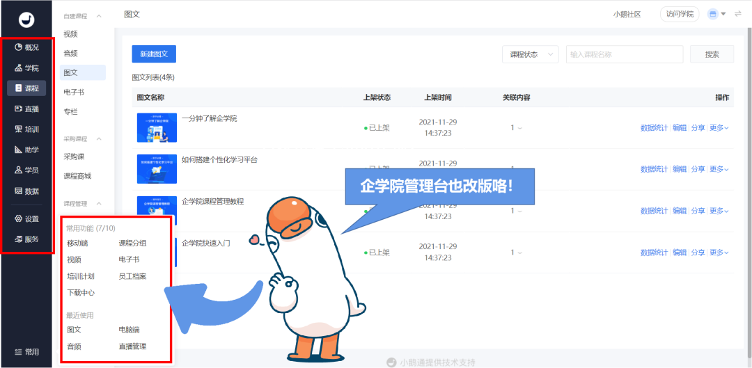 借着管理台改版的东风,企学院管理台也进行了相应的调整,欢迎朋友们使用哦!