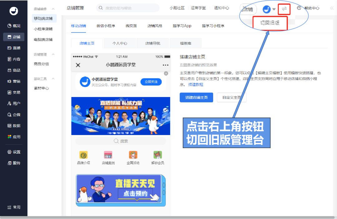 若您想要重回旧版管理台,可以点击右上角的切换按钮,一键切回旧版。同时,多店铺下不同管理员之间互相不影响,可以自由选择新旧版管理台。