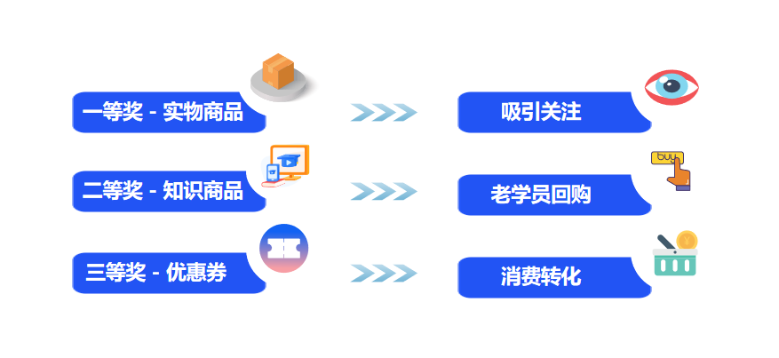 促进后续转化,添加课程/商品、优惠券码、积分为奖品,学员转化更有保障。