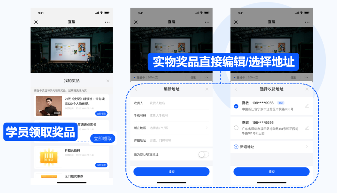 实物商品:学员点击领取时,输入或选择已有地址并提交方可领取成功。