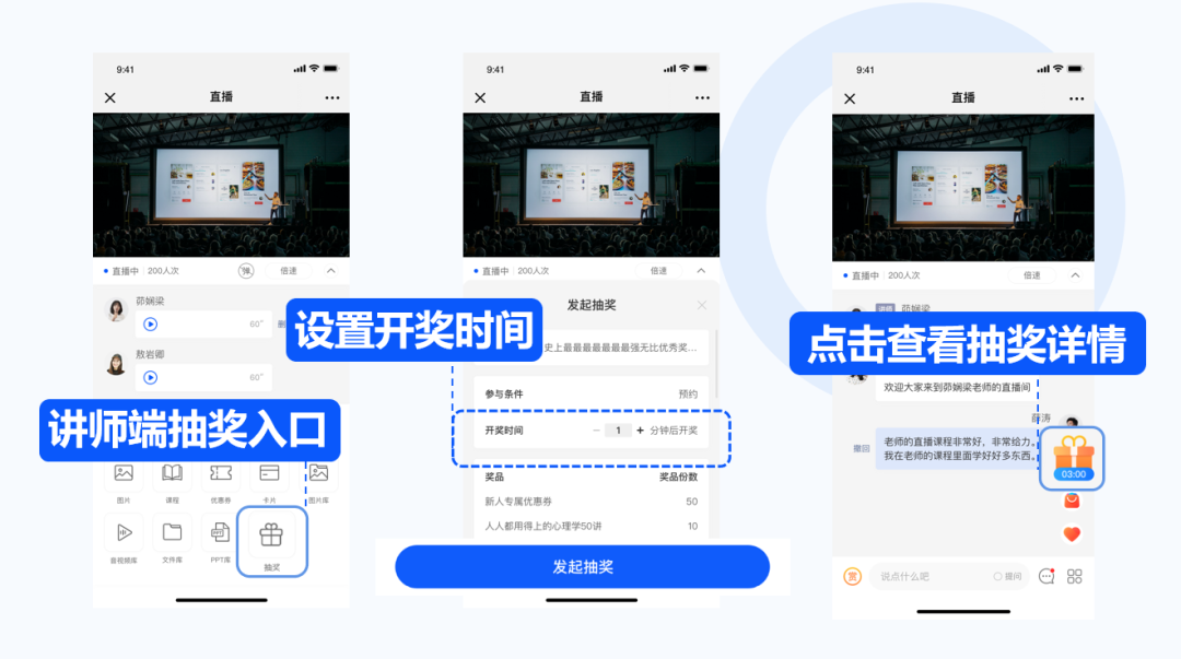 直播进行中,讲师可以选择发起抽奖,并可以设置开奖时间(支持设置自动开奖时间为1-120分钟后)。