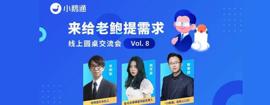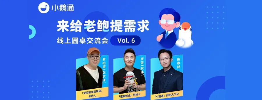 如果您对我们有更多需求或者建议,欢迎点击下方《来给老鲍提需求》直播间,直接向小鹅通CEO老鲍提需求!优秀的建议还会有小鹅通专业版和鹅公仔赠送哟~
