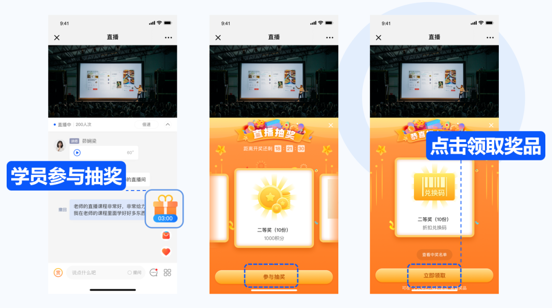 有了这个功能,商家创建完直播课程后,就可以在管理台开启并添加抽奖,讲师在直播中可以直接选择发起抽奖,学员参与后,中奖了更可以直接领奖。