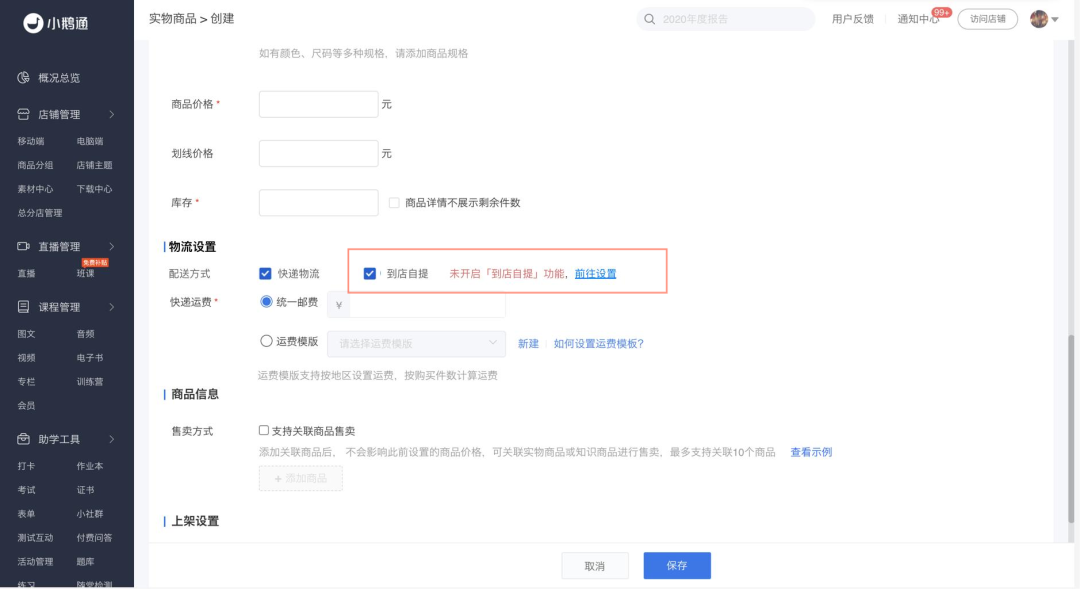 现在创建实物商品,新增「到店自提」选项。从此用户下单时,可以根据情况选择「快递配送」或是「到店自提」哦!