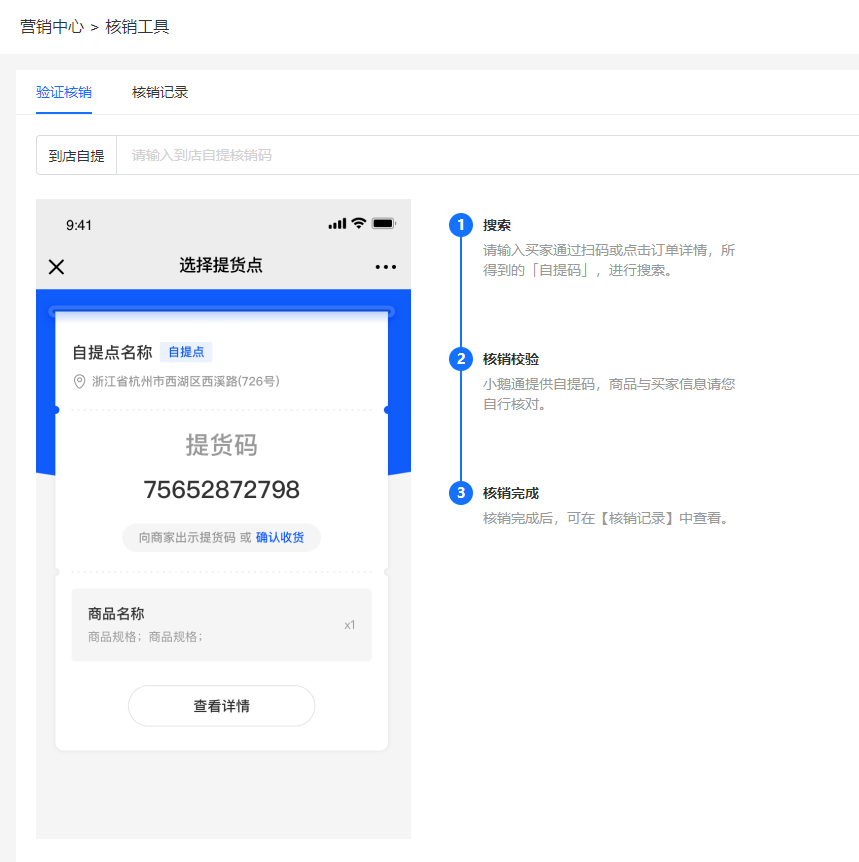 营销中心新增配套【核销工具】,输入买家提货码,即可找到订单并核销,方便专人专项进行核销工作。