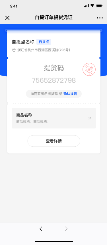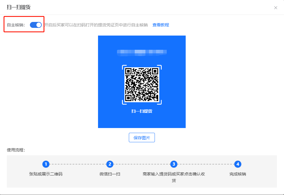 关闭【自主核销】,买家扫码后,可以快速获取提货码,提供给商家进行订单核销。