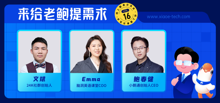 如果您对我们有更多需求或者建议,欢迎点击下方《来给老鲍提需求》直播间,直接向小鹅通CEO老鲍提需求!优秀的建议还会有小鹅通专业版和鹅公仔赠送哟~