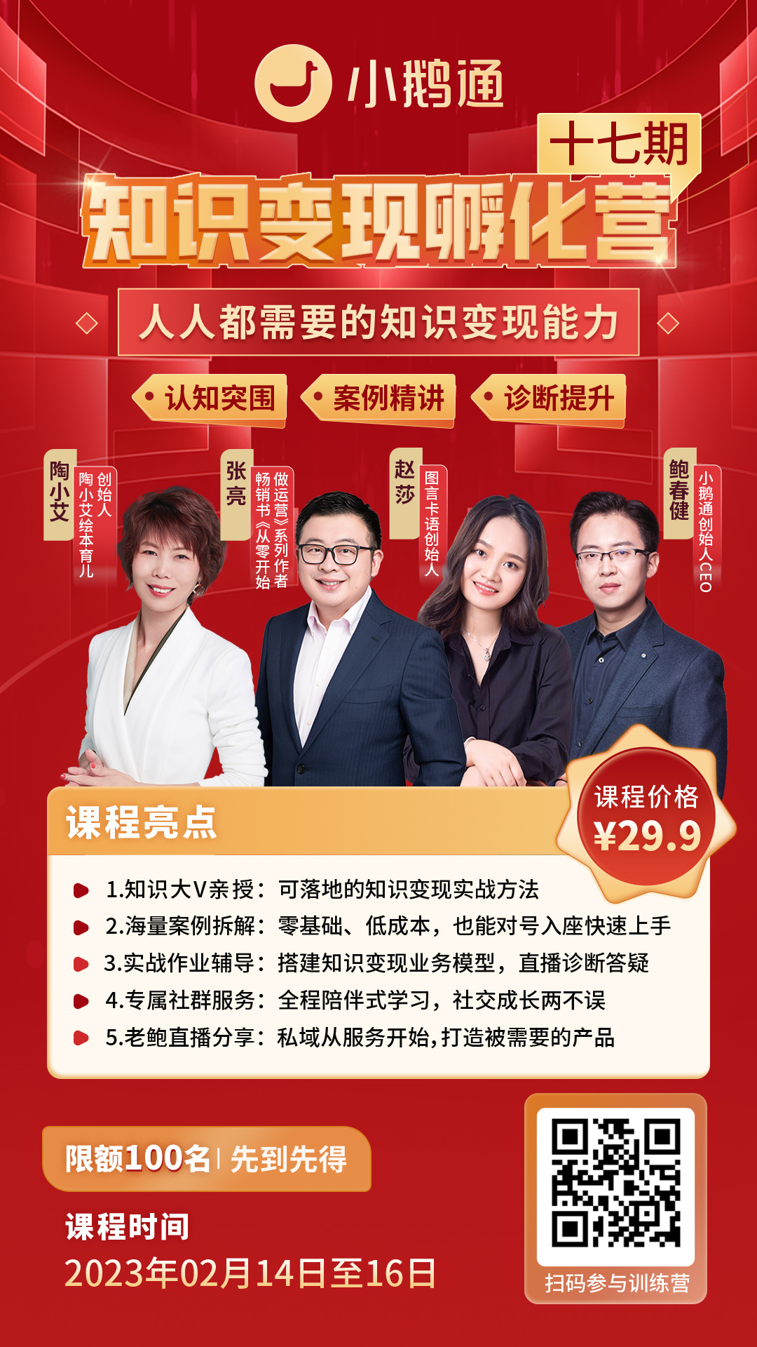 知识变现孵化营第17期正式火热招生中,每期限额100名,先到先得: