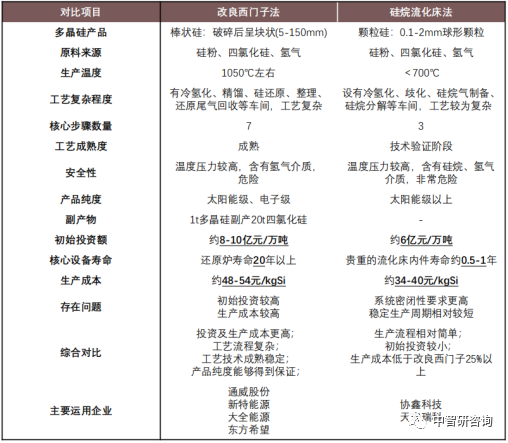 多晶硅的生产方式主要有改良西门子法与硅烷流化床法,其中,改良西门子法所生产出的多晶硅形态表现为块状,即棒状硅;硅烷流床法生产出的多晶硅形态表现为球形颗粒状,即颗粒硅。目前,改良西门子法是中国多晶硅生产的主要方法,2021年棒状硅与颗粒硅的市场占比分别为95.9%、4.1%,市场上颗粒硅企业仅协鑫科技与天宏瑞科。