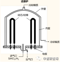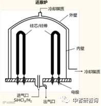 核心生产设备多晶硅还原炉,是发生三氯化硅氢还原反应的场所。还原炉作为生产多晶硅的核心设备,其价值量占多晶硅生产设备的 40%以上。在改良西门子法的生产流程中,氯气和氢气混合成氯化氢,氯化氢与工业硅粉在一定的温度下生成三氯氢硅,经过提纯的三氯氢硅和高纯氢混合后,通入1150℃还原炉内进行反应,生成的高纯多晶硅淀积在多晶硅载体上,即可得到最终产品多晶硅棒。示意图如下所示: