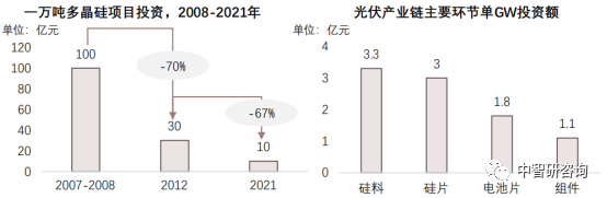 2021年,中国每万吨多晶硅生产项目投资额约为8至10亿元,在光伏产业链中属于投资金额需求最大的环节。2007年至2021年间,受益于工艺技术进步、生产设备国产化以及规模化应用的成本下降等因素,中国多晶硅项目投资额快速下降,2008至2012年,2012至2021年分别下降70%与67%,但目前相较于光伏产业链其他环节仍是资金需求最大的部分。