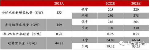假设条件:1.光伏新增装机容量:根据 CPIA 预测,在保守情况下 2022/2023 年全球光伏新增装机容量分别为 205/220GW,乐观情况下全球光伏新增装机容量分别为 250/275GW;
