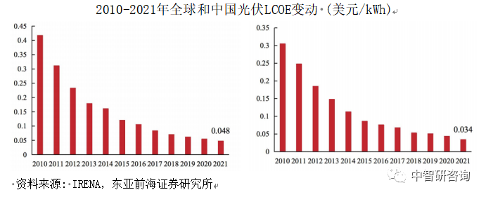 根据 IRENA 预测,2022年全球光伏LCOE将降至0.04美元/千瓦时,将低于燃煤发电成本。从中国范围内来看,中国光伏平准化度电成本(LCOE)由2010年的0.305美元/千瓦时下降到2021年的0.034美元/千瓦时,降幅达88.85%,且中国光伏度电成本低于全球水平,性价比更优。