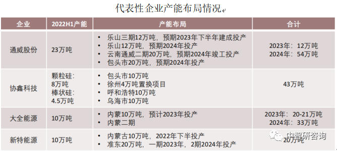 从各主要企业已有产能来看,截至2022年上半年,通威股份已有产能及规划产能皆为行业内最高水平。其中,仅协鑫科技具有颗粒硅产能8.5万吨,且协鑫科技规划后期皆主要布局颗粒硅产能,与行业主流棒状硅呈现差异化竞争。从合计产能规划来看,头部企业皆积极进行产能布局,2023年至2024年产能扩张幅度皆超200%,规划产能可以满足未来超637GW光伏组件需求,未来可能面临多晶硅产能过剩风险。