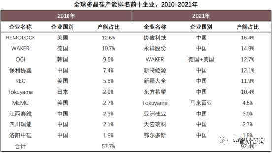 世界多晶硅产能在过去数十年间不断走向集中,中国企业目前在世界多晶硅产量方面占主导地位。从2010与2021年世界多晶硅产能占比前十企业排名来看,2010年世界多晶硅制备产能与技术主要由美国日本、德国与韩国等企业所掌握,中国早期多晶硅市场主要依赖进口采购,随着中国企业不断在技术工艺上取得突破,且凭借中国较低的原材料及能源成本优势,国外部分成本较高企业退出多晶硅市场至2021年全球多晶硅产能前十的企业中,中国拥有共上榜8家,共占全球多晶硅产能73.2%。2021年末,全球前十大多晶硅生产企业合计产能达到86.78万吨,产能占比达到92.4%。