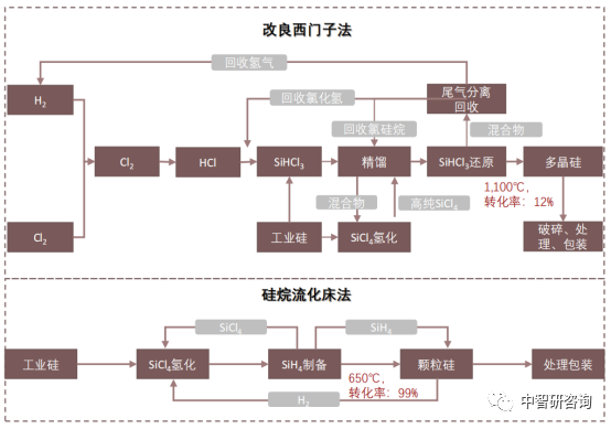 (一)改良西门子法: 改良西门子法指首先采用氯气与氢气为原料合成氯化氢,再以氯化氢与工业硅为原料在硫化床反应器中合成三氯硅烷。三氯硅烷在精馏塔中脱氢脱重,完成提纯,再在还原炉中实现三氯硅烷的还原。其中,副产物四氯化硅再重新与治金级硅、氢气进行反应,进行氢化分离生产三氯硅烷完成回收利用。