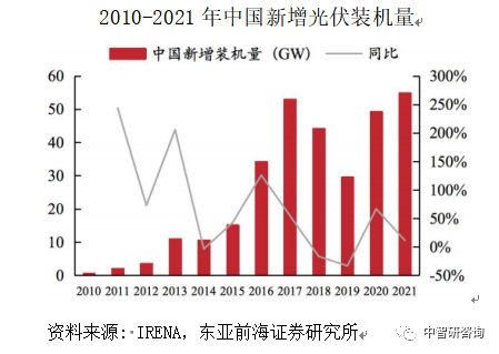 据IRENA数据,在全球碳中和加速的背景下,叠加光伏发电成本持续下探,经济性不断提升,全球光伏新增装机量由2010年的17.46GW提升至2021年的132.81GW,CAGR达到20.26%,如下图所示。根据CPIA预测,2025年全球新增光伏装机量将达到270-330GW。