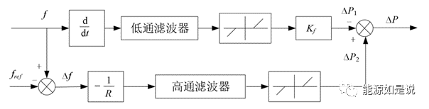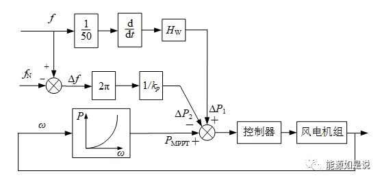 转子动能控制主要包括附加虚拟惯性控制和下垂控制。虚拟惯性控制的作用是使风电机组具有与常规发电机组类似的自然调频能力,通过模拟同步机转动惯量特性实现风电机组参与系统调频;下垂控制的原理是模拟同步机的有功功率静态频率特性曲线,对风电机组的有功出力做出适当调整。