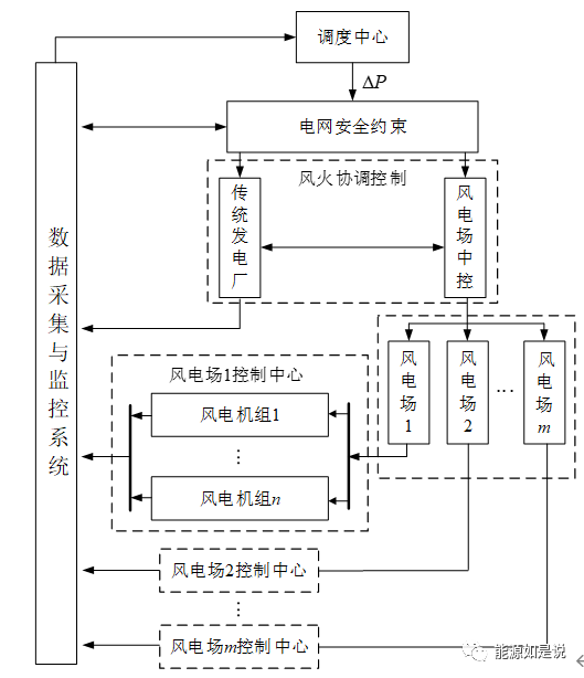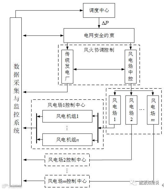 该方案利用调度中心实时分配功率缺额给火电厂和风电场,然后火电厂和风电场快速响应调频,给电力系统补充功率缺额。联合调频过程中,需要协调火电厂和风电场以及风电场内风电机组间的调频功率。当系统频率跌落时,假设此时电力系统的有功缺额为∆P,调度中心根据火电厂和风电场实时的运行工况,将功率缺额下发到火电厂和风电场,火电厂和风电场控制中心按照调度中心下发的功率缺额进行调频控制,其中,风电场控制中心根据风电机组的实时风速对风电机组进行分组,然后按照权重因子实现调频功率的最优分配,快速响应系统频率变化。