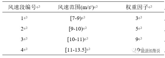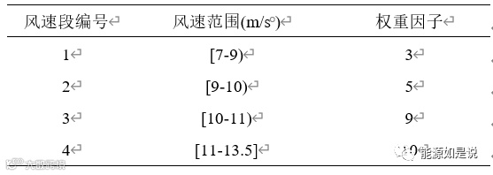将风电场转子动能控制的风速段分为4组进行控制,此分配方法可确保不同风速段分配不同的功率参考值并且较高风速段功率参考值高于较低风速段。由权重因子及各风速段风机数量可计算出各组风机的分配功率