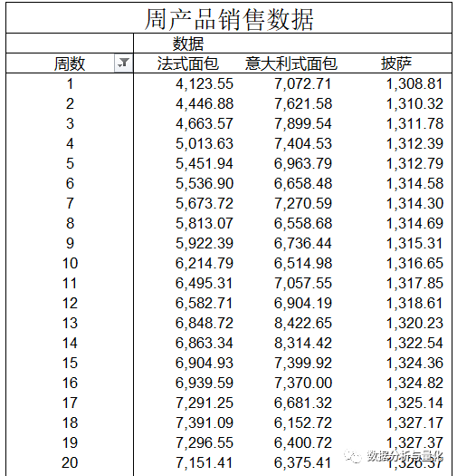 目前面包店已经收到这个月的订货,花小姐必须要在这个月确定本月和下个月的原材料订单,因此必须预测未来两个月内的销售数据,也就是利用上表种的173周数据预测未来8周的销量。