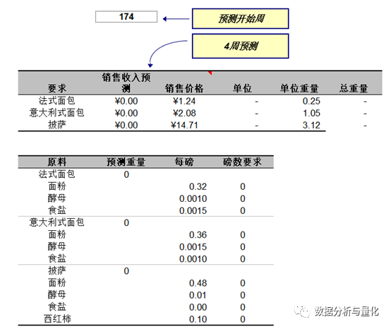 在未来两个月花小姐没有调整产品价格的计划,每种产品的单位质量和单价不变,因此预测原料的需求量首先要知道3种产品的销售量。建立该数学模型的思路:商品销售预测->商品重量预测->原材料预测。在excel中建立数学模型如下图所示: