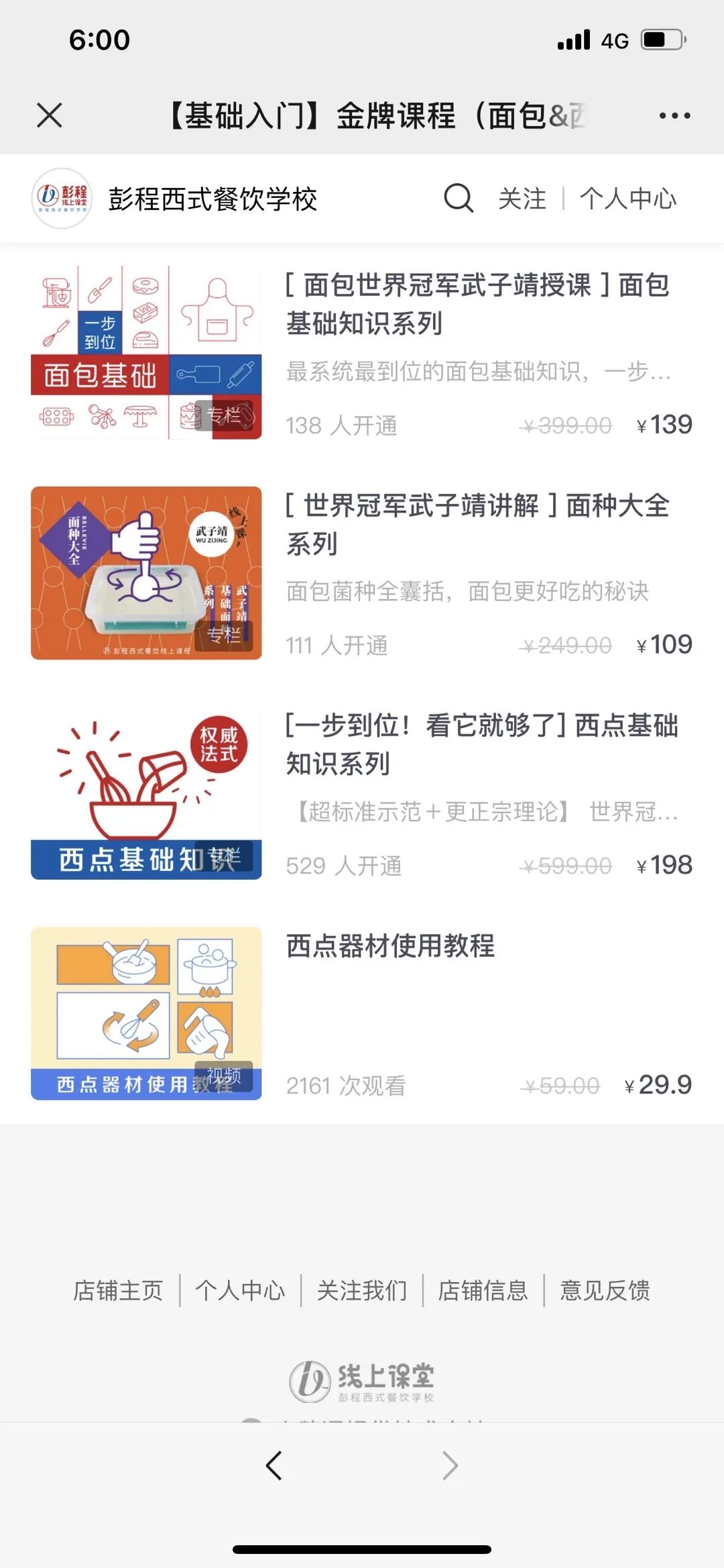 转型线上后,小鹅通店铺承载了「彭程西式餐饮学院」所有的线上课程,每一个上线的产品,都是学校教学团队以最专业的标准来选择的。