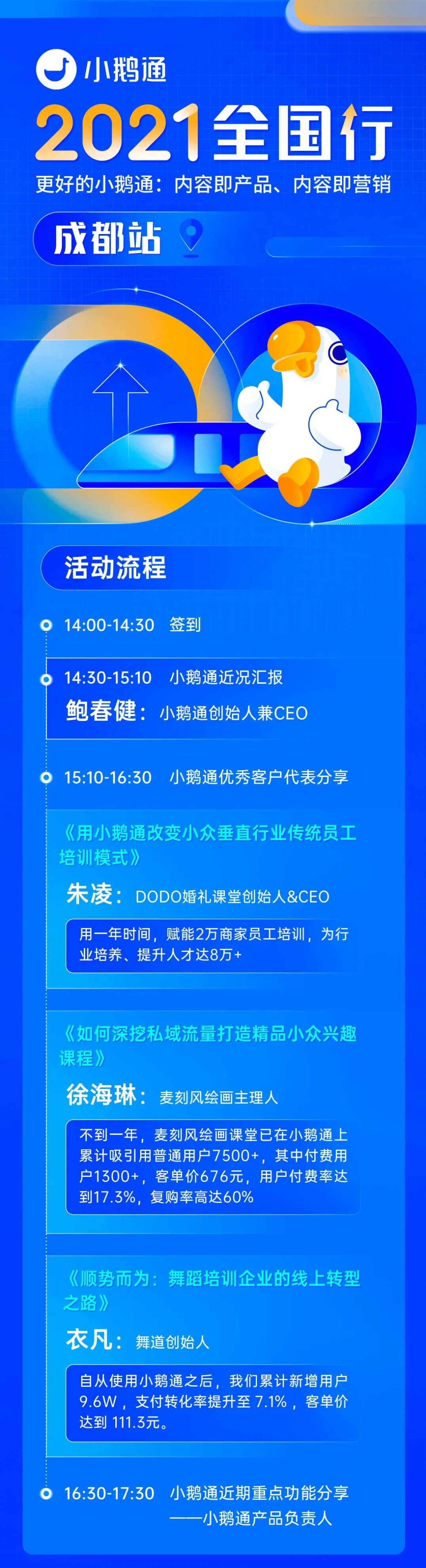 小鹅通2021全国行成都站(4月23日周五)现已开启报名,名额有限,马上扫码参与: