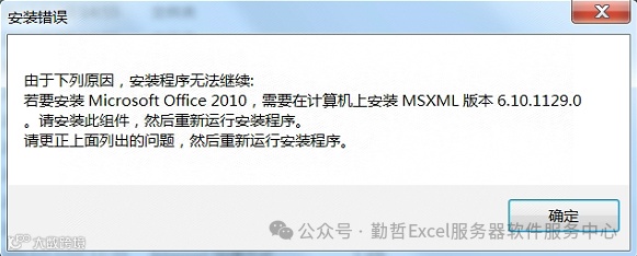 问题:在win7 64位操作系统中,安装office2010时出现如下提示:需要在此计算机上安装 MSXML 版本 6.10.1129.0。请安装此组件,然后重新运行安装程序。请更正上面列出的问题,然后重新运行安装程序。