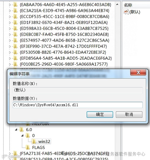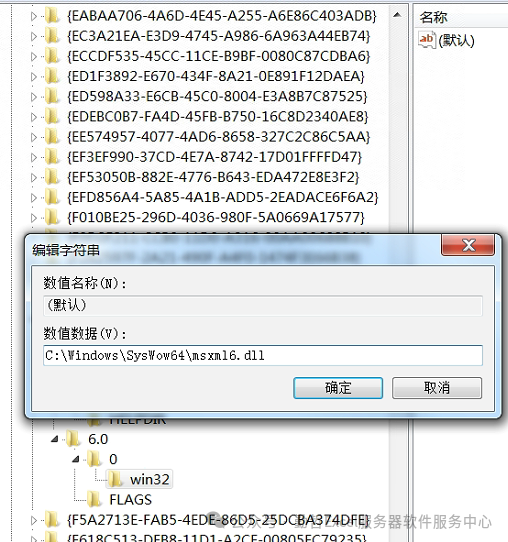 “HKEY_CLASSES_ROOT\TypeLib{F5078F18-C551-11D3-89B9-0000F81FE221}\6.0\0\win32”,选中“win32”项,在右侧窗口中,找到名为“(默认)”的项,右键单击并选择“修改”。将数值数据更改为“C:\Windows\SysWow64\msxml6.dll”,然后点击确定。
