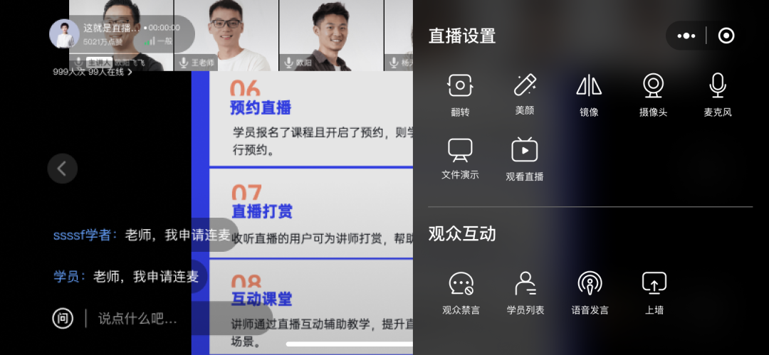 进入直播间后,主讲人可邀请在线讲师/学员连麦,讲师/学员可主动申请上麦。若中途暂时离开,可重新上麦。