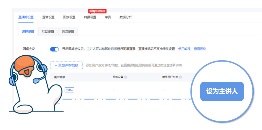主讲人是圆桌会议的主讲角色,具备开始直播,邀请嘉宾连麦,上传课件等重要权限。