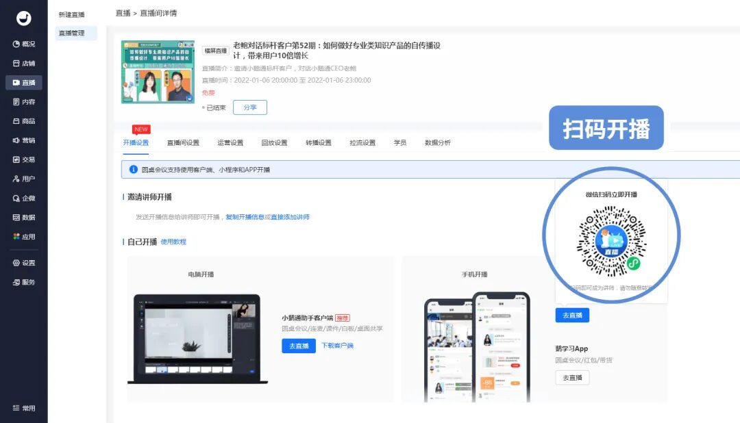 另外,还能将直播同步转播到第三方平台。如《来给老鲍提需求》,将小鹅通直播间分屏连麦画面转播到了视频号,让视频号直播内容更有吸引力。
