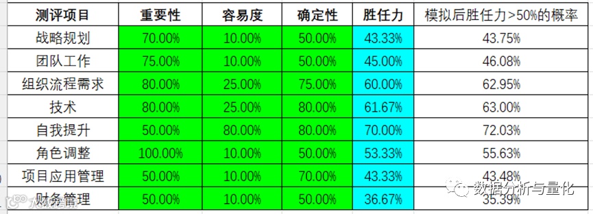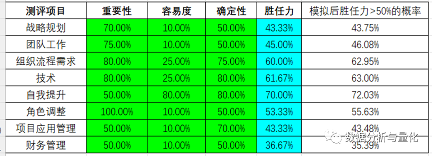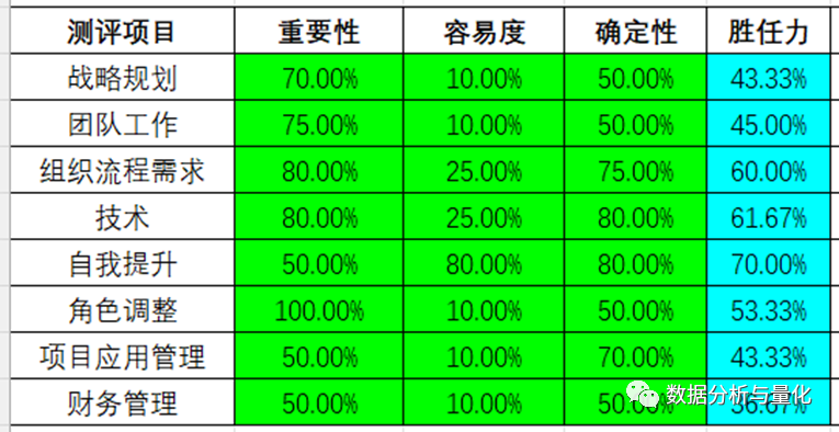 然后,对这八类因素分别从三方面(重要性、难度、确定性)进行胜任力评估。三方面的评估值按百分数估计,从 0-100%,胜任力取三者 (考虑到难度对胜任力是负相关关系,为方便计算对其计算转换为1—难度)的平均值,值越高意味着胜任力越大。