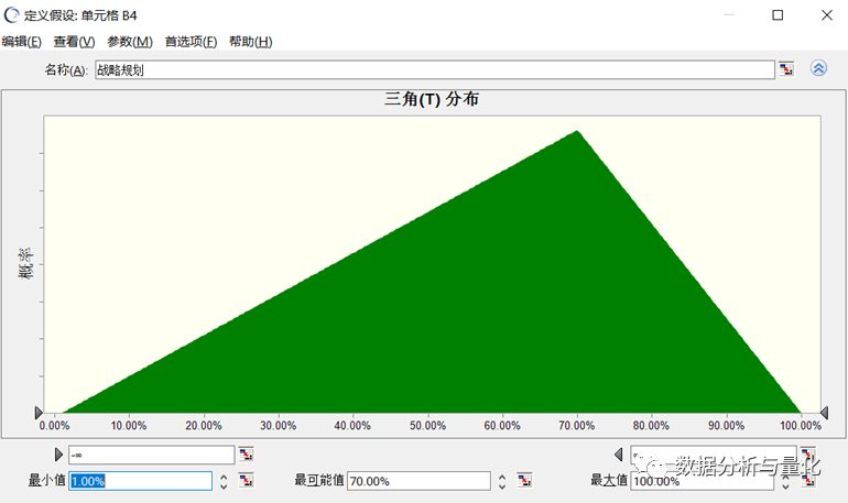 把建好的测评项目输入到 Excel 表格中,输入相应的数值和公式,定义相关变量的概率分布,分别如下图所示。其中图 1中难度直接转换为容易度,胜任力为三者的简单平均;图2中是对IT团队工作能力变量的概率分布,定义为三角分布,最小值 1%,最大值 100%,最可能值定义成图1中的数据,其他项目与此类似。