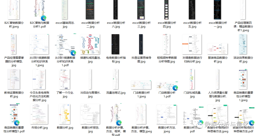 除了数万份研报,在工作实践中原创或者收集了近百份关于数据分析、电商运营、互联网运营、市场分析等领域的思维导图,以及阅读数据和互联网相关书籍的笔记思维导图: