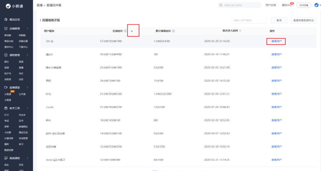 通过直播观看详情和在线时长,筛选核心学员重点运营,更可以通过查看用户-联系用户功能,给核心学员发送消息、优惠券,贴运营标签等,精准进行转化。