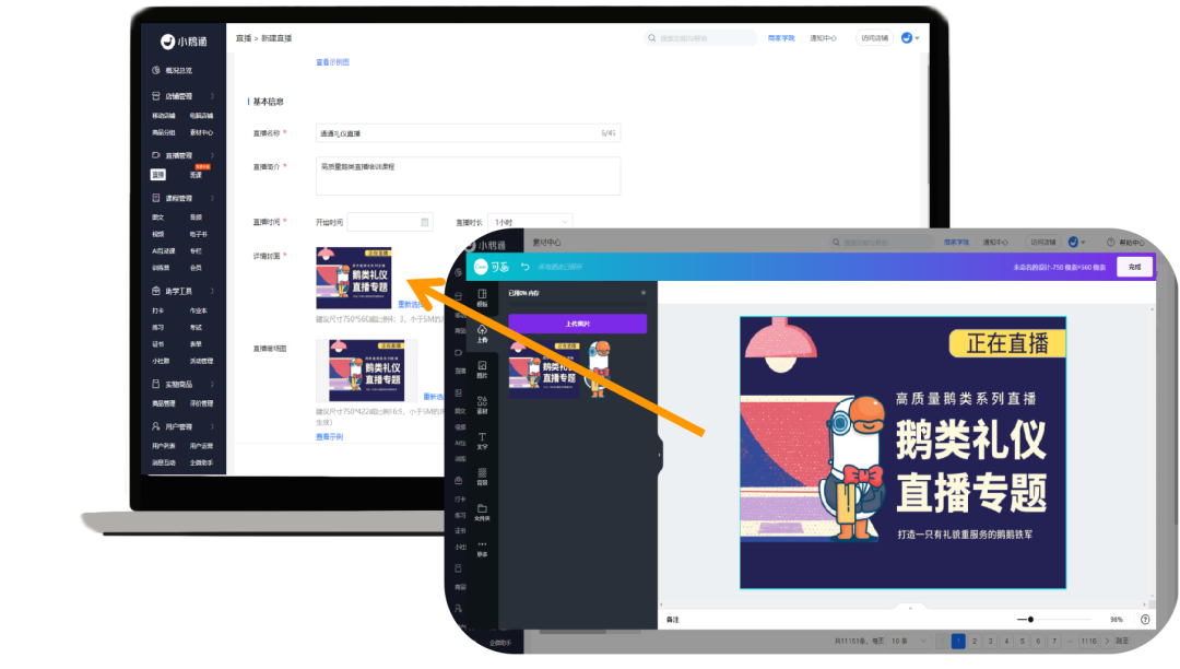 小鹅通管理后台现在支持在线做图啦!我们为你接入了在线平面设计软件,在线选模板,套用做图,只为解决你的店铺装修和课程包装难题,让你的课程更好看,销售更加棒!